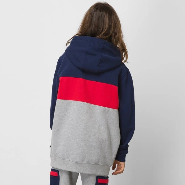 The Kids’ Color Block Pullover Sweatshirt is a 60% cotton, 40% polyester fleece pullover hooded sweatshirt with a colorblocked construction, signature center chest logo graphics, and a front pouch pocket.